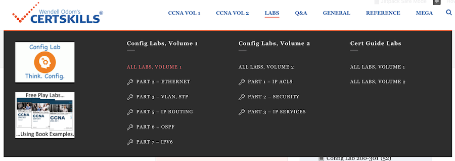 To find Config Labs, click the blog top menu “Lab” item to reveal a menu similar to the following figure. The choices in the Config Lab menus launch an advanced search page with a list of Config Labs. Your menu choices allow you to list all Config Labs related to either of the two CCNA Official Cert Guide Volumes, or all Config Labs in one Part of one of the books.